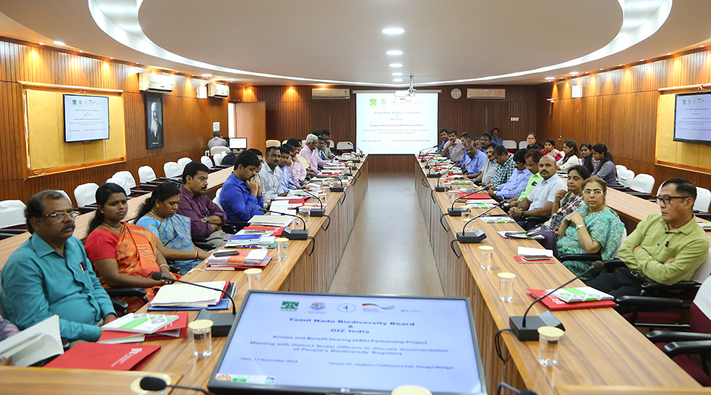 A workshop was conducted on 13 November 2018 at Chennai, to discuss the processes involved in documenting PBRs with District Nodal Officers from all districts of Tamil Nadu. Senior officials from the Tamil Nadu Forest Department, Dr. H. Malleshappa IFS, PCCF (HOD), and Mr. T. P. Raghunath IFS, PCCF and Chief Wildlife Warden, initiated the workshop. They urged the District Nodal Officers, who are also the District Forest Officers, to take proactive measures in strengthening BMCs to carry out activities as mandated under the Biological Diversity Act, 2002. They also lauded the efforts of the ABS Partnership Project in this regard. Dr. Oommen V. Oommen, former Chairperson, Kerala Biodiversity Board, and Dr. Kunal Satyarthi, Member Secretary, Himachal Pradesh Biodiversity Board, were the resource speakers for the workshop.