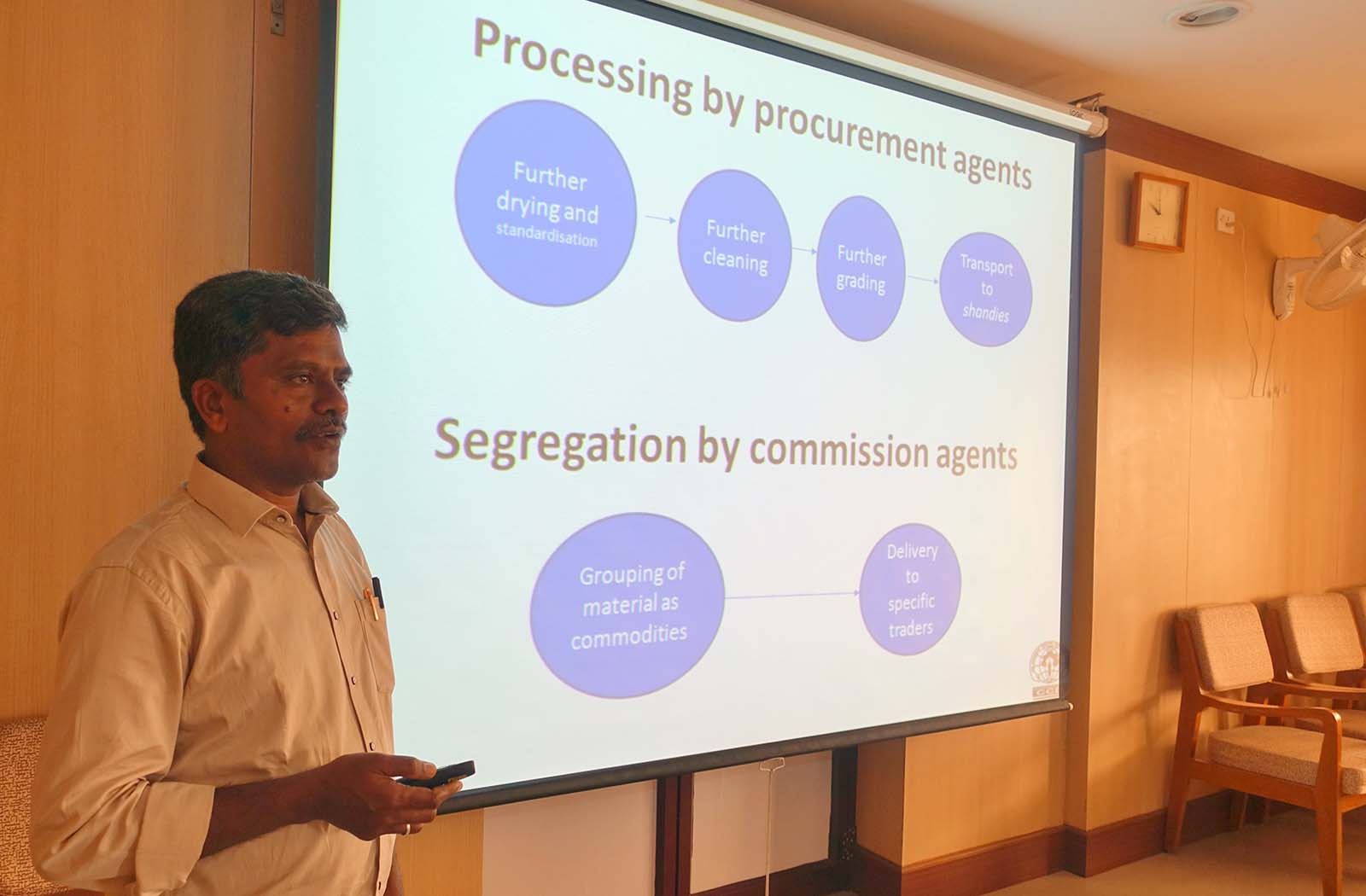 Mr. John Britto, Covenant Centre for Development, Madurai, presented the results of the study. The study identified the socio-economic status of the gatherers involved in the trade of these 20 selected species, the commonly collected parts of the medicinal plants, methods of gathering the plants, reasons for decline in the quantities collected and other external factors contributing to reduced gathering of medicinal plants. The study also identified the processing at various stages in the trade from the gatherers and medicinal plant cultivators to agencies, agents and traders, to processors and exporters. The traditional knowledge of gatherers for sustainable harvesting and traders for their insights into the demands of the trade were also highlighted. Other actors identified in the study were traditional healers and research stations.