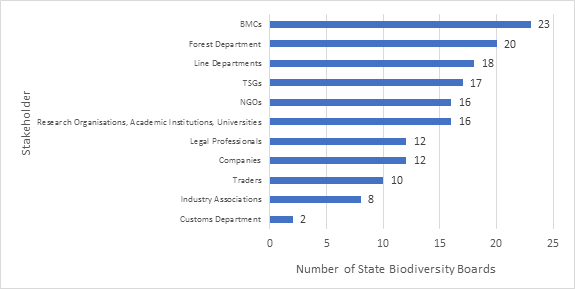 Although the concept of Access and Benefit Sharing (ABS) has been in place since the enactment of the Indian Biological Diversity Act, 2002, awareness about ABS and related issues is limited. Engagement with a range of stakeholders is necessary for effective implementation of ABS. A survey conducted by the ABS Partnership Project showed that the SBBs interact with about 11 stakeholders (see figure 1) – each having a specific role in ABS. Communicating the mandates of the Act to the variety of stakeholders involved requires a strategic approach.