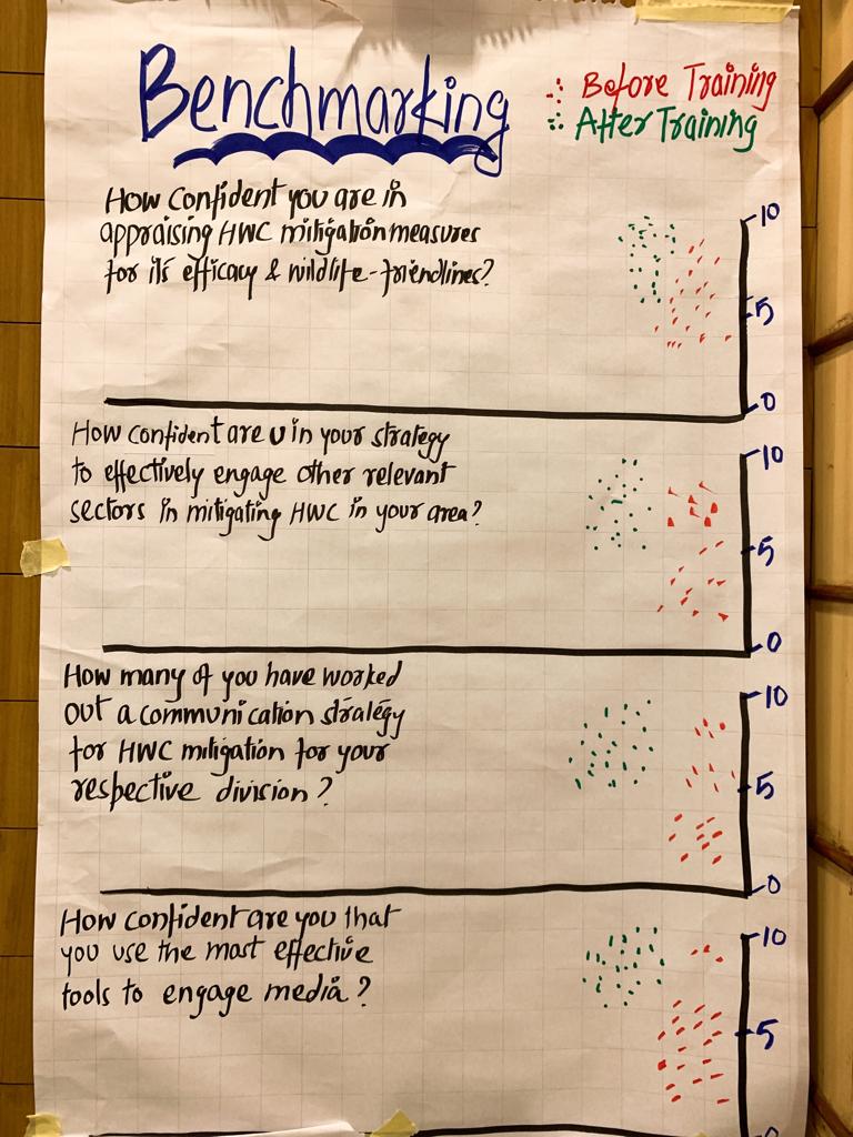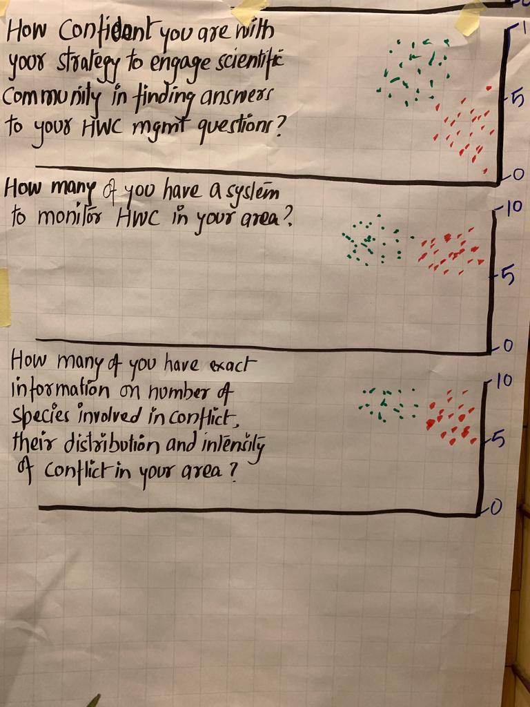 During the Knowledge Cafe the participants worked on developing action plans on key issues, such as rapid response teams, communication strategy, strategy to effectively engage scientific research to answer management questions and action plan to effectively engage key sectors and stakeholders. Participants also worked on their personal learning goals -each participant taking three specific goals on HWC mitigation action for the next 3 to 6 months.