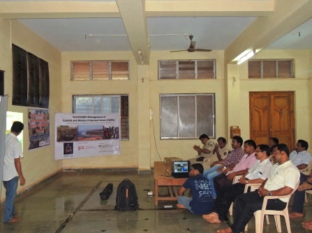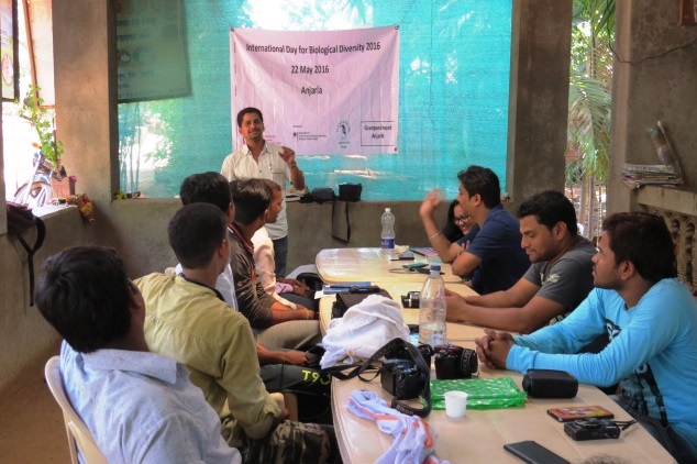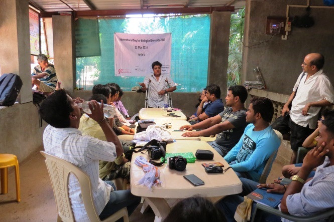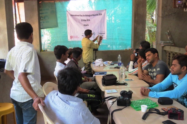 In pictures (from left): Ms. Jhunjhunwala making presentation on the need for biodiversity conservation and measures to safeguard local biodiversity An event, to mark the International Day for Biological Diversity was jointly organised by GIZ’s CMPA project and the Maharashtra Forest Department at Padle village, Maharashtra. The event was attended by the village members, teachers from the village body, high school, Forest Department and Maharashtra State Biodiversity Board (MSBB). Mr. Jambhale, Forester from the Maharashtra Forest Department, gave the welcome note, after which the discussion on the local biodiversity and its role in the well-being of people was highlighted in a presentation by Ms. Supriya Jhunjhunwala, Advisor & Coordinator, CMPA Project, Maharashtra. Ms. Jhunjhunwala also deliberated on the issues of effects of plastic pollution, and other measures that can be taken to safeguard the local flora and fauna. Discussion on different aspects of biodiversity management This was followed by a group discussion, led by Sarpanch of Aade, Ms. Akshata Humne and Mr. Dalvi, president of the Biodiversity Management Committee and the session was moderated by Mr. Abhinay Kelaskar and Mr. Mohan Upadhye, Project associates from the CMPA Maharashtra Project. The group discussion saw a lively discussion on topics related to the goals and operation of the Biodiversity Management Committee, and its roles in the topics presented in the earlier presentation. The following question and answer session was coordinated by Mr. Dalvi, Forest Guard from Maharashtra Forest Department and Mr. Dhadve, vice-president of the village body. The event saw participation from teachers from the village body, high school, forest department and Maharashtra State Biodiversity Board. Photo Credits: Maharashtra Forest Department, Sahyadri Nisarga Mitra (SNM), and GIZ's CMPA project, Maharashtra In pictures (from left): Red Wattled Lapwing and Intermediate Egret. Photo Credit: Indo-German Biodiversity Programme “Intermediate Egret, Red Wattled Lapwing, Purple Sunbird, Common Sand Piper, Small Green Bee- Eater, Magpie Robin” are just a few of the 21 birds that were spotted during a nature trek organised for a group of more than 20 participants on the occasion of International Day for Biodiversity. The nature trek was a part of a special programme, jointly organised by Sahyadri Nisarga Mitra (SNM) and GIZ’s CMPA project to increase understanding and create awareness on biodiversity issues amongst people in the Anjarle village (Maharashtra) on 22 May, 2016. The participants, comprising of youngsters and tourists had gathered at 7 in the morning for the trek, which was guided by Mr. Sadaf Kaduekar, an SNM member from Chiplun. The trek covered a patch of deciduous forest and mangrove between Anjarle and the neighbouring village-Murdi. The group also observed pugmarks of civet, common fishes in the mangroves, butterflies like small orange tip and plants etc. In pictures (from left to right): Participants observing birds during the nature trek. Mr. Sadaf Kaudekar explaining difference between poisonous and non-poisonous snake bite Besides the nature trek, the group was also introduced, through the medium of presentations to various conservation efforts being conducted by GIZ’s CMPA project along with SNM in Velas and Anjarle. A session, dedicated to the various species of snakes (poisonous and non-poisonous snakes), was also conducted by Mr. Sadaf Kaudekar. The presentation on conservation efforts in Anjarle was made by Mr. Abhinay Kelaskar and on turtle tourism in Velas by Mr. Mohan Upadhye. In pictures (from left to right): Mr. Mohan Upadhye presenting on turtle tourism in Velas. Mr. Atharva Soman presenting on amateur bird photography Final presentation in this session was done by Mr. Atharva Soman, a differently abled youth from Dapoli, who is also an amateur bird photographer. Atharva shared some important tips for bird photographing like timing, dressing, appropriate places and equipment for photographing arboreal birds, water birds, birds of prey etc. The presentations were followed by a field visit to the Velas Turtle Conservation Area and Vulture café. Photo Credits: Sahyadri Nisarga Mitra (SNM), GIZ's CMPA project, Maharashtra, and Indo-German Biodiversity Programme Officials from the Maharashtra Forest Department discussing biodiversity management The celebrations for International Day for Biological Diversity at Anjarle focused on the integration and extension of the efforts of the Maharashtra Forest Department through the several interventions planned under GIZ’s CMPA Project. Protection of ecological resources is one of the key objectives for the Forest Department. Mr. Raj Varak, Range Forest Officer of the Maharashtra Forest Department, during the meeting highlighted the steps taken by the local administration towards protection of biodiversity. He further stressed on ways in which community members in the village can actively participate and complement forest department’s efforts through Biodiversity Management Committees. Representatives from the Forest Department, Mr. Jambhale, Mr. Nimkar and Mr. Dalvi also presented the department’s perspective and ways to support the project objectives. The meeting saw participation from the members of the village and the Biodiversity Management Committee (BMC). The event ended with takeaway message from Project Associates of the CMPA Project on the working of the BMC. Presentations made by Project Associates of the CMPA project, Maharashtra Photo Credits: Maharashtra Forest Department, and GIZ's CMPA project, MaharashtraBiodiversity Management, and its Significance for the Well-Being of People