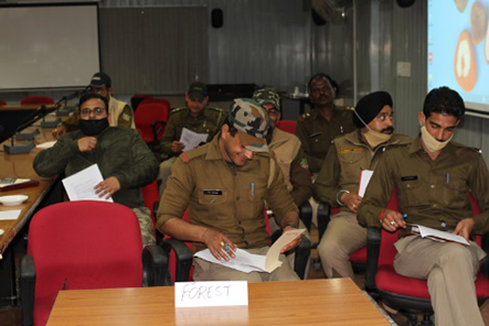As a long-term solution, Mrs Kukreti Kumar emphasised identifying people who can raise awareness or can be involved in the capture situations. Regular interactions with such groups, particularly the youth, by involving them in activities such as sports, can help establish long-term positive networks. Such groups can be involved in capacity building exercises, and involved in situations immediately for managin crowds. This was followed by an interactive session of question-answers and experience sharing. The participants shared some difficult crowd build-up situations they had faced. Mrs Kukreti suggested that if in an urgent situation the SP or SSP may be needed to be involved, the frontline staff should inform the DFOs or higher authority. For handling situations involving women, female officers should be involved and if needed help can be taken from the female staff of government offices, Anganwadi workers, etc. These interactions should also be recorded on video.