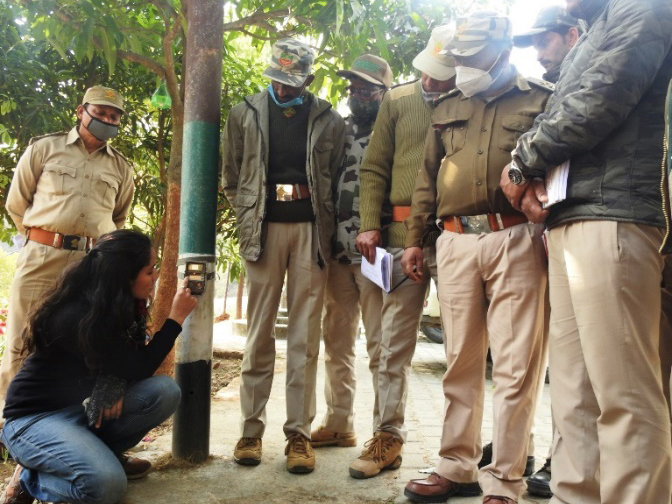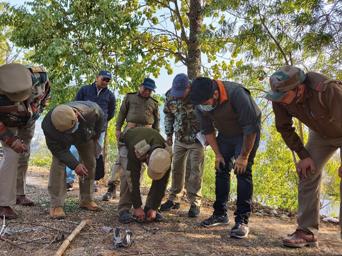 The second session of the training involved demonstration and hands-on training of various tools and equipment used for animal capture, tracking and monitoring, which are necessary steps for establishing an early-warning system and mitigating HWC. Dr Sathyakumar and Ms Ranjana Pal (Research Scholar-WII) demonstrated various equipment and techniques to the participants and discussed their usage and challenges. These were camera traps, tracking wildlife using radiotelemetry and GPS (Global Positioning System), use of deterrents such as fox lights, compass, and ear tags to mark animals. Dr Sanath K Muliya demonstrated the use of various tools and equipment for physical and chemical restraint of species of interest viz., black bear and leopard. For physical constraint, he demonstrated and provided hands-on training on the use of Aldrich foothold snare for black bear and humane leg hold trap or padded leg hold trap for leopard. Further, he talked about the use and mechanism of remote drug delivery system or darting system and demonstrated various models including DenInject JMSP – a Denmark made equipment and Telinject model GUT.50. He further demonstrated the use of blowpipe and jab stick and preparation of various types of darts, followed by hands-on training. He discussed various drugs to be used and their availability in Indian scenario and noted the importance of the presence and guidance of an experienced veterinarian for successful rescue and capture operations. Mr Abhishek Singh, Chairman – Wild EFFECT demonstrated the use of a locally made, lightweight pepper spray (Bear Spray).