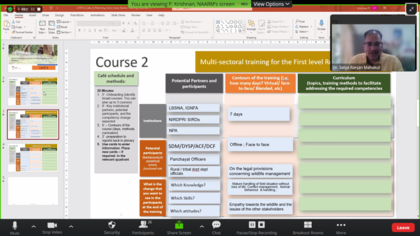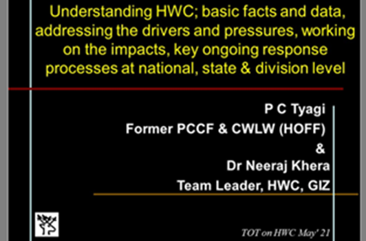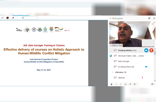 In this context, a four-day ‘Training of Trainers for Effective delivery of courses on Holistic Approach to Human-Wildlife Conflict Mitigation’, was organised by IGNFA and GIZ from 11-14 May 2021 via online mode. The training was joined by 29 senior trainers and faculty members from nine premier national training institutes of India - Indira Gandhi National Forest Academy (IGNFA), Central Zoo Authority (CZA), National Academy of Agricultural Research Management -Indian Council of Agricultural Research (NAARM-ICAR), National Institute of Rural Development (NIRD), National Institute of Disaster Management (NIDM), Jamia Milia Islamia, Police Academy, Lal Bahadur Shastri National Academy of Administration (LBSNAA), and National Disaster Response Force (NDRF).