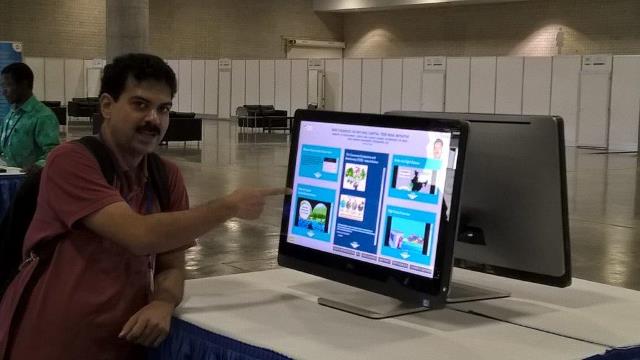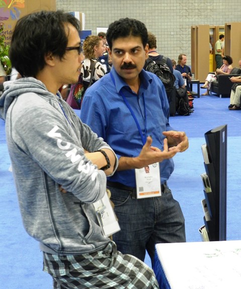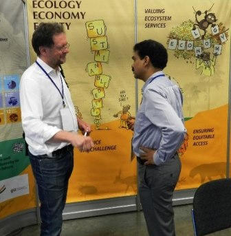 In pictures (left) Dr. Mathur, WII, sharing his feedback for the booth posters. (right) Mr. Ravindra Singh interacting with Mr. Alexander Müller