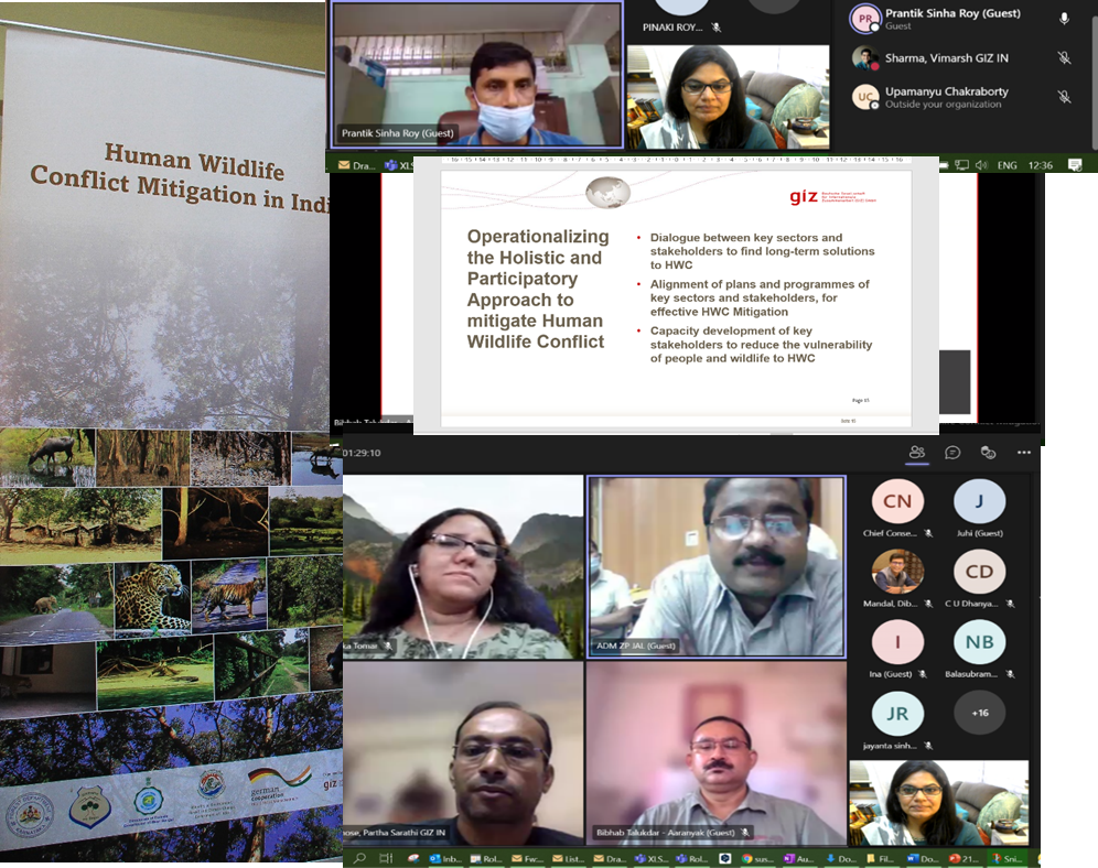 Under the Indo-German project on Human-Wildlife Conflict (HWC) Mitigation, a virtual workshop on the “Role of Rural Development and Panchayati Raj Institutions and Experts in Human-Wildlife Conflict Mitigation in West Bengal” was organised on 4 August 2021 with over 33 officers and functionaries of the Rural Development and Panchayati Raj Institutions and State Forest Department in West Bengal, experts from GIZ, Aaranyak, Centre for Environment Education (CEC) and other national experts.