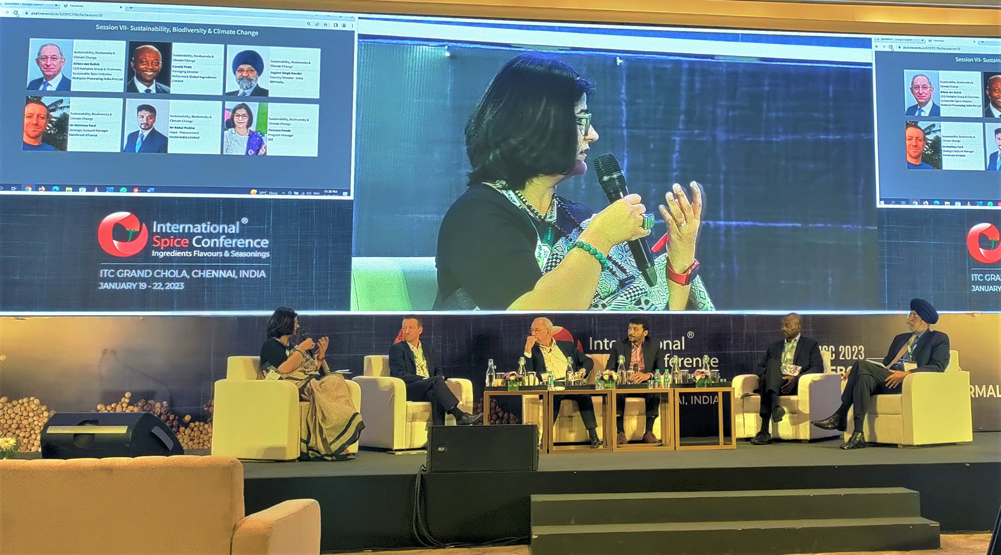 International Spice Conference 2023 (ISC 2023) was held on January 19-22nd, 2023, in ITC Grand Chola, Chennai. The conference was attended by 850 participants and visitors from 50 countries including 60 exhibitors and 50 speakers. The theme for the 4-day conference, which began on a Thursday, was ‘Reboot N’ Rebound’ – Beyond the new normal. The conference was inaugurated by Mr. D. Sathiyan, IFS, Secretary, Spices Board. GIZ - DPP Spices Project was Biodiversity Partner for the conference and participated in the Panel Discussion for Biodiversity, Climate Change and Sustainability. Mr. Sanjeev Bisht, Chairman, All India Spices Exporters Forum, Mr. Anand Venkitraman, Vice-President, Cochin Chamber of Commerce and Industry, Mr. Cheriyan Xavier, Chairman, International Spice Conference 2023, and Mr. Emmanuel Nambusseril, Vice chairman of AISEF spoke in the inaugural session.