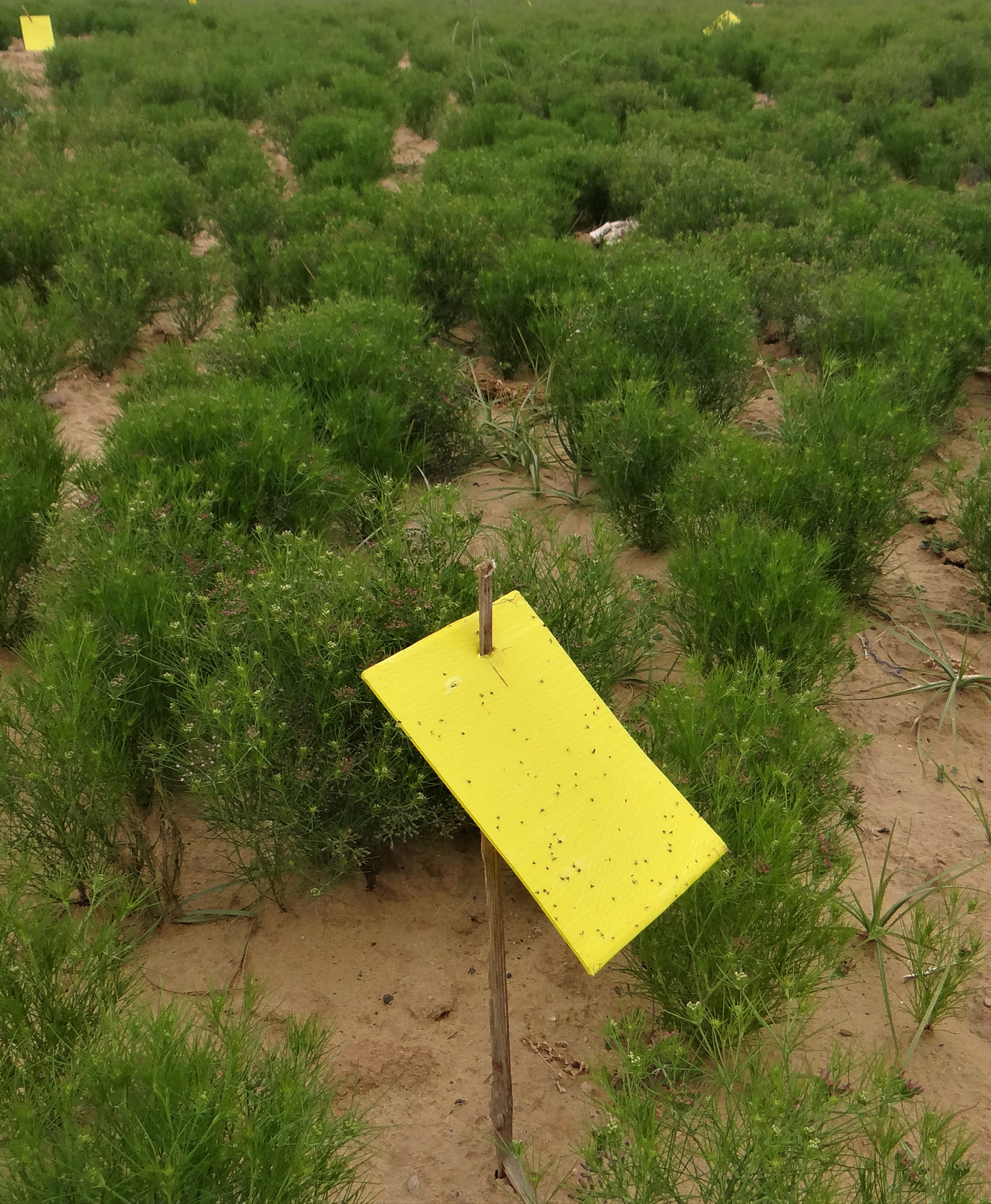 Installation of Yellow Stciky traps in Mr. Alla Bax’s cumin field to control and monitor aphid attacks, ©Pradnya Thombare/GIZ