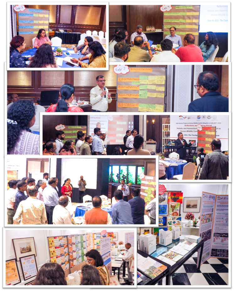 A Knowledge Café in the afternoon of 16th June facilitated dialogue and development of an action plan for implementing the HWC Mitigation Strategy, and Action Plans and guidelines in India post-2023 and beyond the Indo-German Project. Participants were invited to join working groups with the objective to distil, from the presentations and panel discussion, key messages with respect to good practices and lessons learnt; and provide recommendations on how these experiences could be integrated into the future implementation of strategies and plans at national, state and local levels. The café specifically focussed on formulating recommendations on the terms of the reference of the proposed Working Groups as per the HWC-NAP: Working Group for operationalising cross-sector participation through a National HWC Mitigation Forum, Working Group on Capacity Development, Working Group on HWC Mitigation Database, Working Group on HWC Mitigation Communication, and Special Interest Working Groups on species and cross-cutting issues.