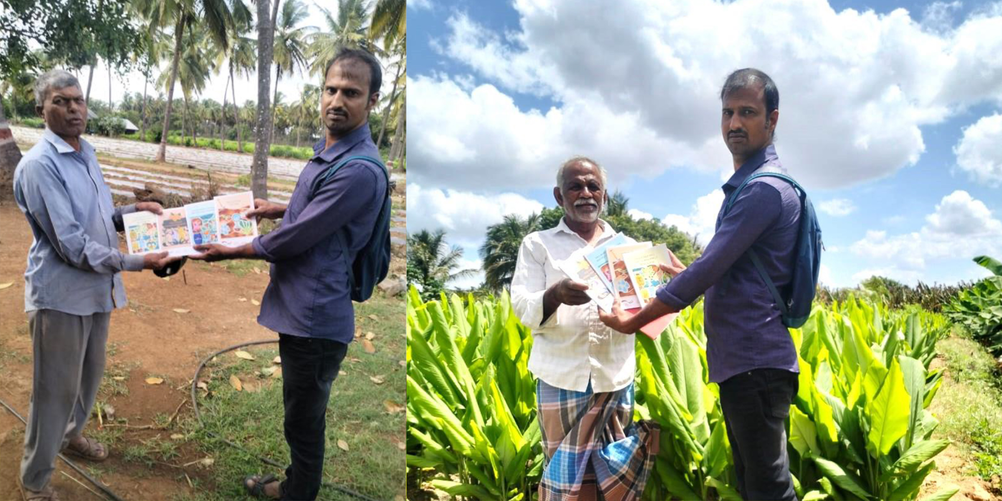Mr. Veerabhadrasamy Field Staff of AVT McCormick distributing the knowledge products to Turmeric farmers of Karnataka © develoPPP Spices Project