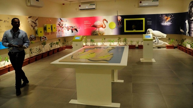 Mr. N. Vasudevan, Head of the Mangrove Cell, demonstrates to the Hon'ble Minister the use of one of the interactive touch screens to display information about the ecology of flamingos. Also present is Dr J. M. Vakily, CMPA Team Leader.