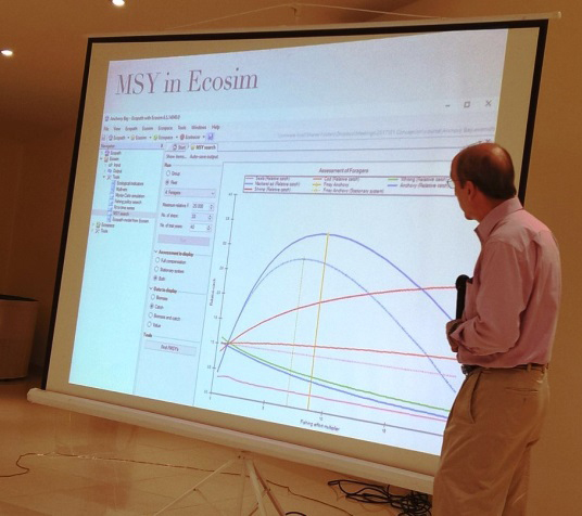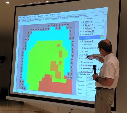 Using a fictitious data set, participants were able to familiarize themselves with the approach to modelling a marine ecosystem and to explore some of the key features of EwE. These ranged from more traditional fisheries stock assessment tools such as Maximum Sustainable Yield (MSY) to extremely powerful routines allowing to simulate the effects of protected areas on the biomass and distribution of fish species. A presentation by Prof. Christensen on the large number of cases where EwE had been used worldwide (e. g. in environmental impact assessment) provided the participants with good examples of where to apply EwE in their own area of research.