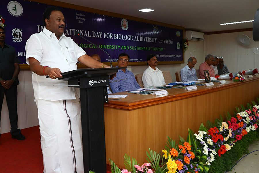 The Hon’ble Minister for Forests, Government of Tamil Nadu, Thiru. Dindigul. C. Srinivasan inaugurated the IDB, 2017 celebrations. The event focused on the central theme for this year “Biodiversity & Sustainable Tourism”. Senior officials from Govt. of Tamil Nadu, Thiru. Md. Nasimuddin, IAS - Principal Secretary E & F, Thiru. P.C Tyagi, IFS , PCCF & CWLW (HoFF), Dr. Basuvaraju, IFS - PCCF (HoD), R.K Upadhaya, IFS, PCCF, T.P Raghunath, IFS - PCCF & CPD, TBGP, and Dr. Shekhar Kumar Neeraj, IFS, Member Secretary in-charge TNBB addressed the gathering on the various aspects of biodiversity, its conservation with a focus on Tamil Nadu.