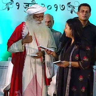 GIZ Adviser Supriya Jhunjhunwala (r.), introducing the field guide to Sadh Guru Jaggi Vasudev