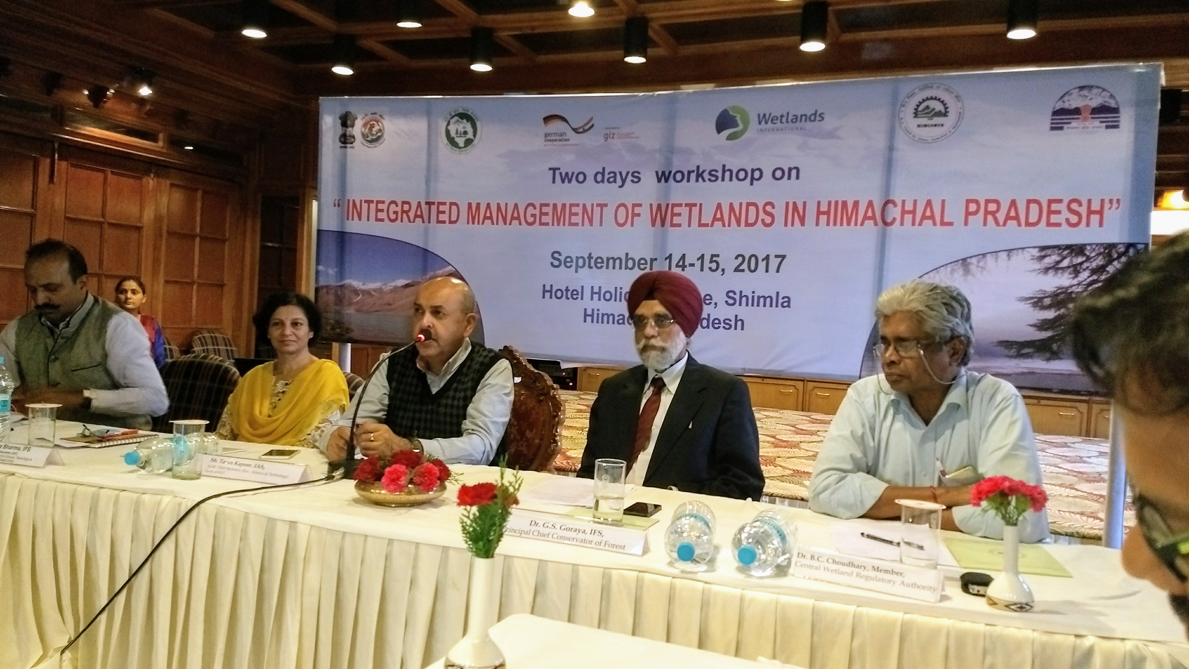 Himachal Pradesh State Council for Science, Technology & Environment (HIMCOSTE), in collaboration with the Himachal Pradesh Forest Department, Indo-German Biodiversity Programme, GIZ and Wetlands International – South Asia, organized a 2-days workshop on “Integrated Management of Wetlands in Himachal Pradesh” on 14-15 Sep,2017 in Shimla. The workshop was attended by over 50 participants, including the Additional Chief Secretary, Environment, Science & Technology, GoHP, PCCF, wetland managers and frontline staff at the three Ramsar sites (Pong, Renuka and Chandertal), Khajjiar and Rewalsar wetlands in the state, representatives from the Forest, Environment, Fisheries and Tourism departments, university and research institutions, State Pollution Control Board, NGOs, media and lawyers.