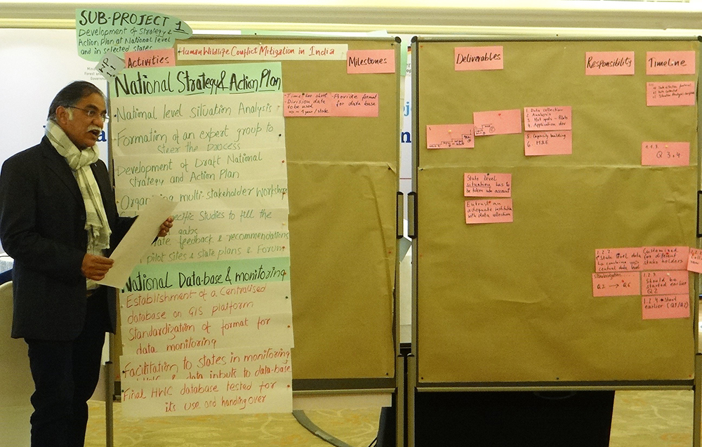 The workshop participants included Sh. Soumitra DasGupta, IGF MoEFCC, Sh Roy P Thomas, Joint Director (Wildlife) MoEFCC, Sh. DVS Khati, PCCF & Chief Wildlife Warden, Dr. Dhananjay Mohan, APCCF, Sh Sanatan Sonakar and Sh. Akash Kumar Verma from Uttarakhand Forest department; Sh Sandeep Sundriyal, APCCF-WL, Sh Ujjal Ghosh and Sh Kumar Vimal from West Bengal Forest department, Sh. Maria Cristo Raja D and Sh. Shivaram Babu from Karnataka Forest Department, Dr. V B Mathur, Director Wildlife Institute of India, Sh Ajay Desai, Dr. Konrad Uebelhoer, Programme Director, Indo-German Biodiversity Programme, GIZ, Dr. Neeraj Khera, Team Leader, HWC Project, GIZ, and Ms. Patricia Dorn, Indo-German Biodiversity Programme, GIZ.