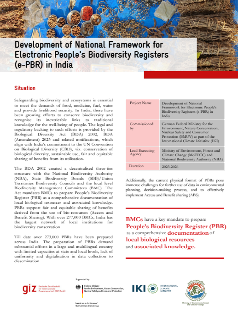 The project aims to support the development and operationalisation of a national electronic People’s Biodiversity Register (e-PBR) Framework by the NBA, SSBs and selected BMCs to strengthen the implementation of fair and equitable sharing of benefits arising from the use of bio-resources at local-level.