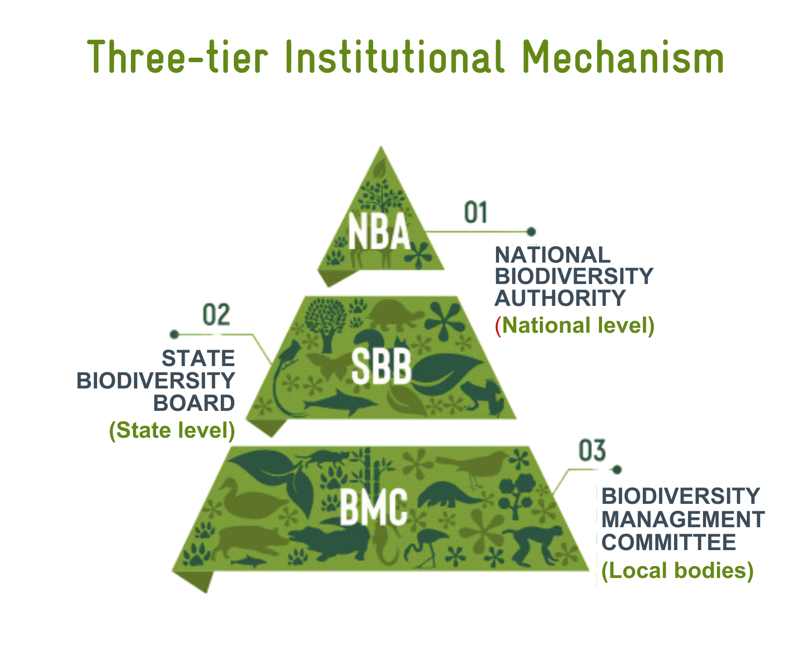 The BDA 2002 created a decentralised three-tier structure with the National Biodiversity Authority (NBA), State Biodiversity Boards (SBB)/Union Territories Biodiversity Councils and the local level Biodiversity Management Committees (BMC).